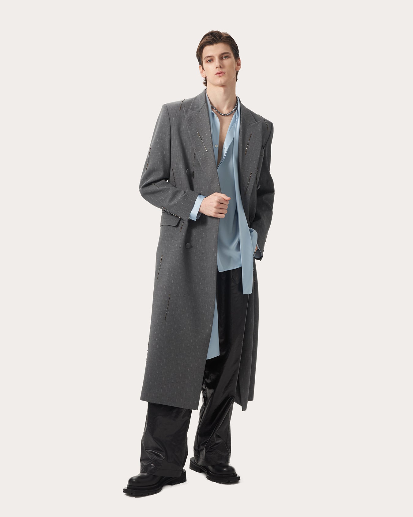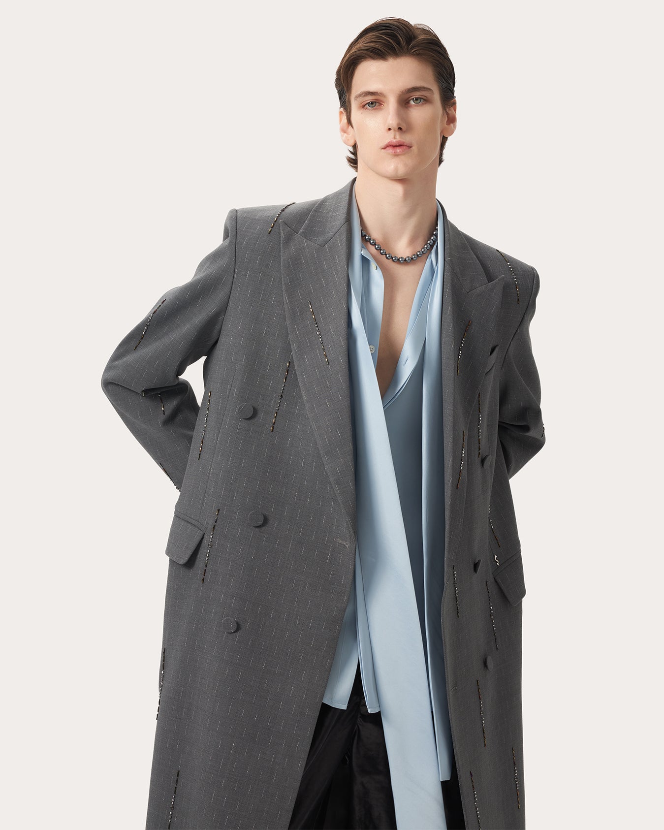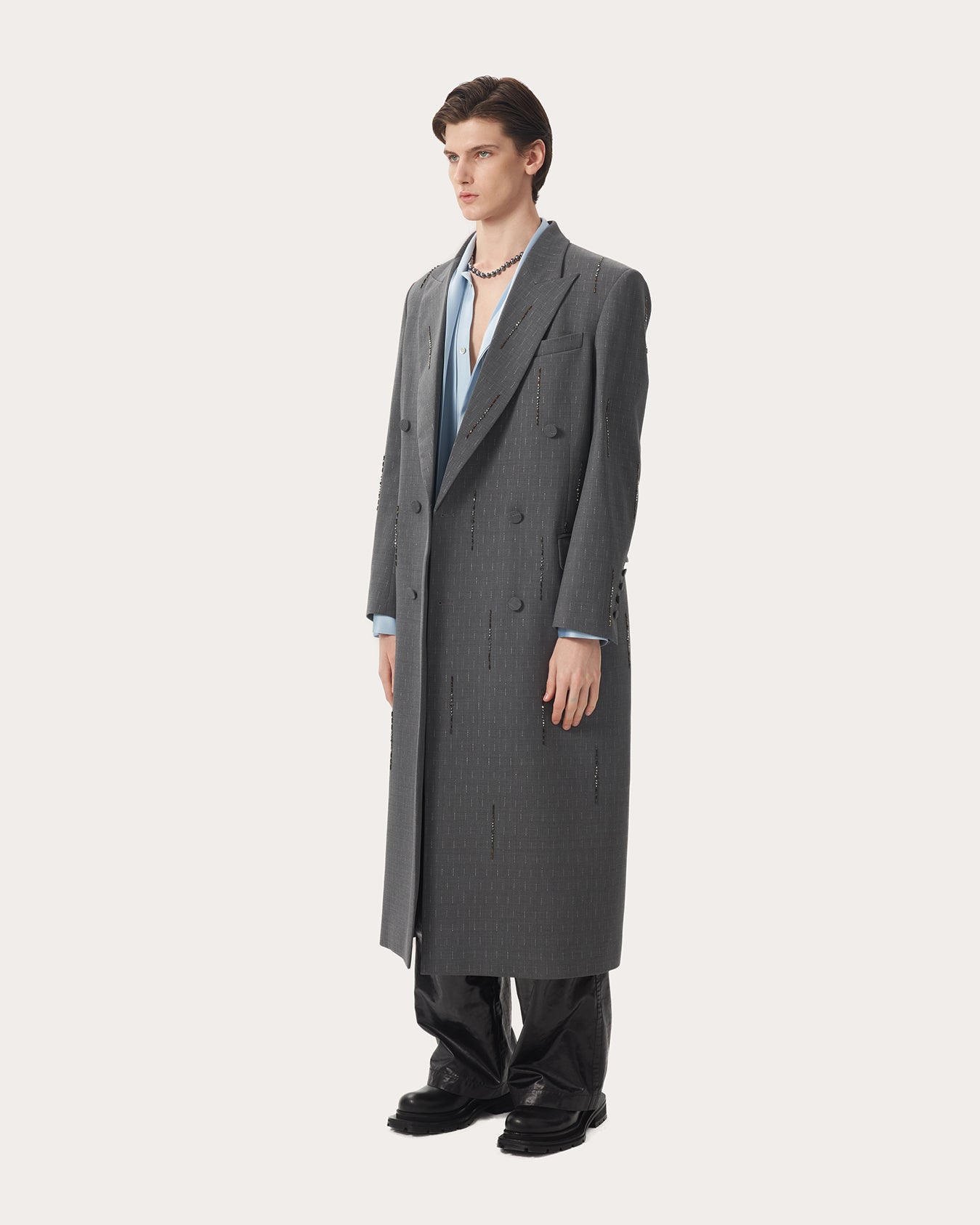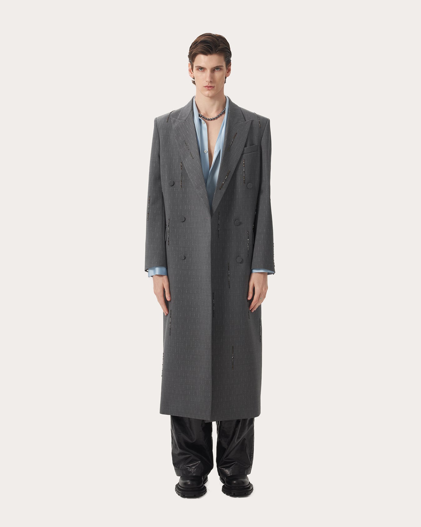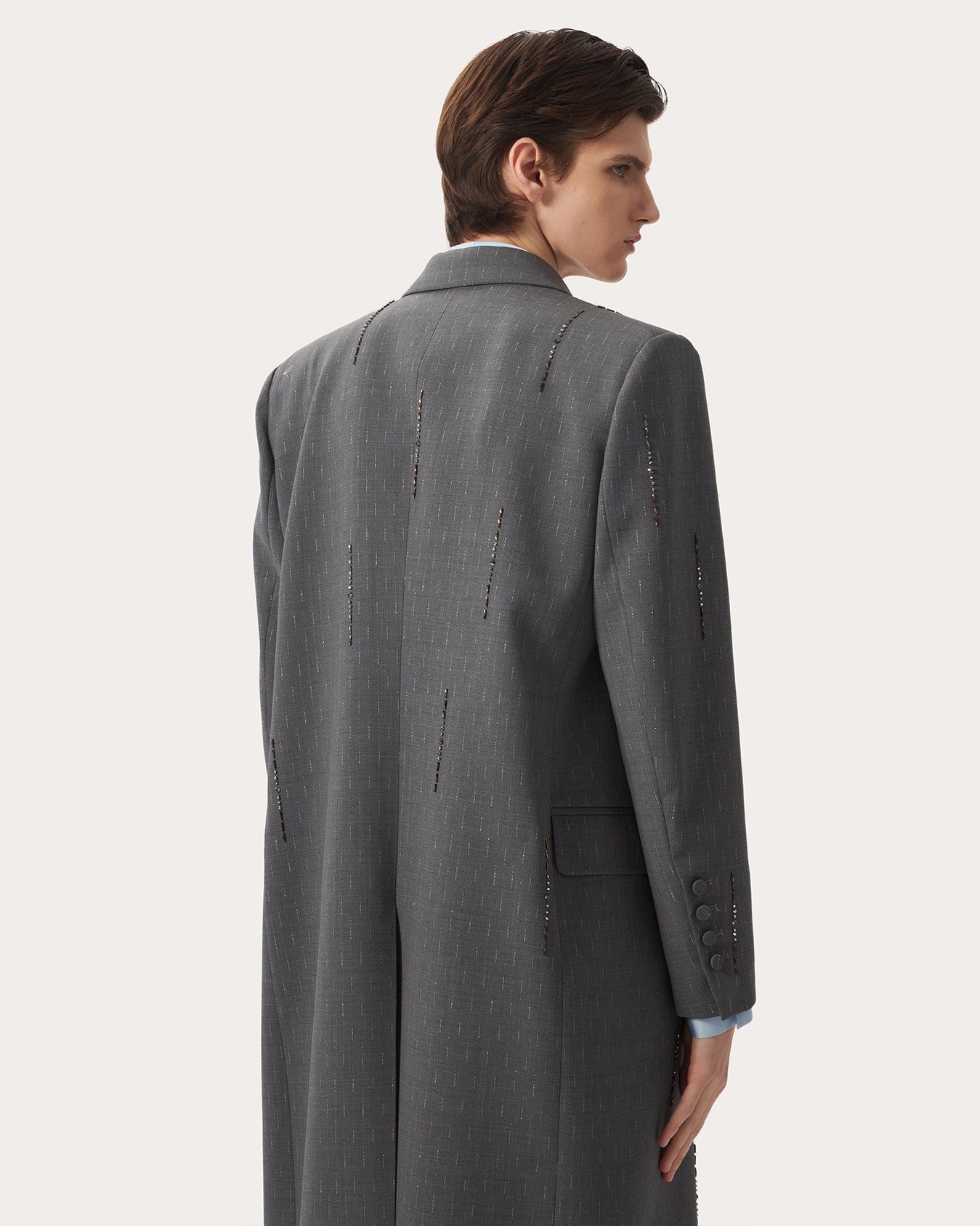 Long-cut blazer made of fine wool with an irregular striped texture, embellished with beading details