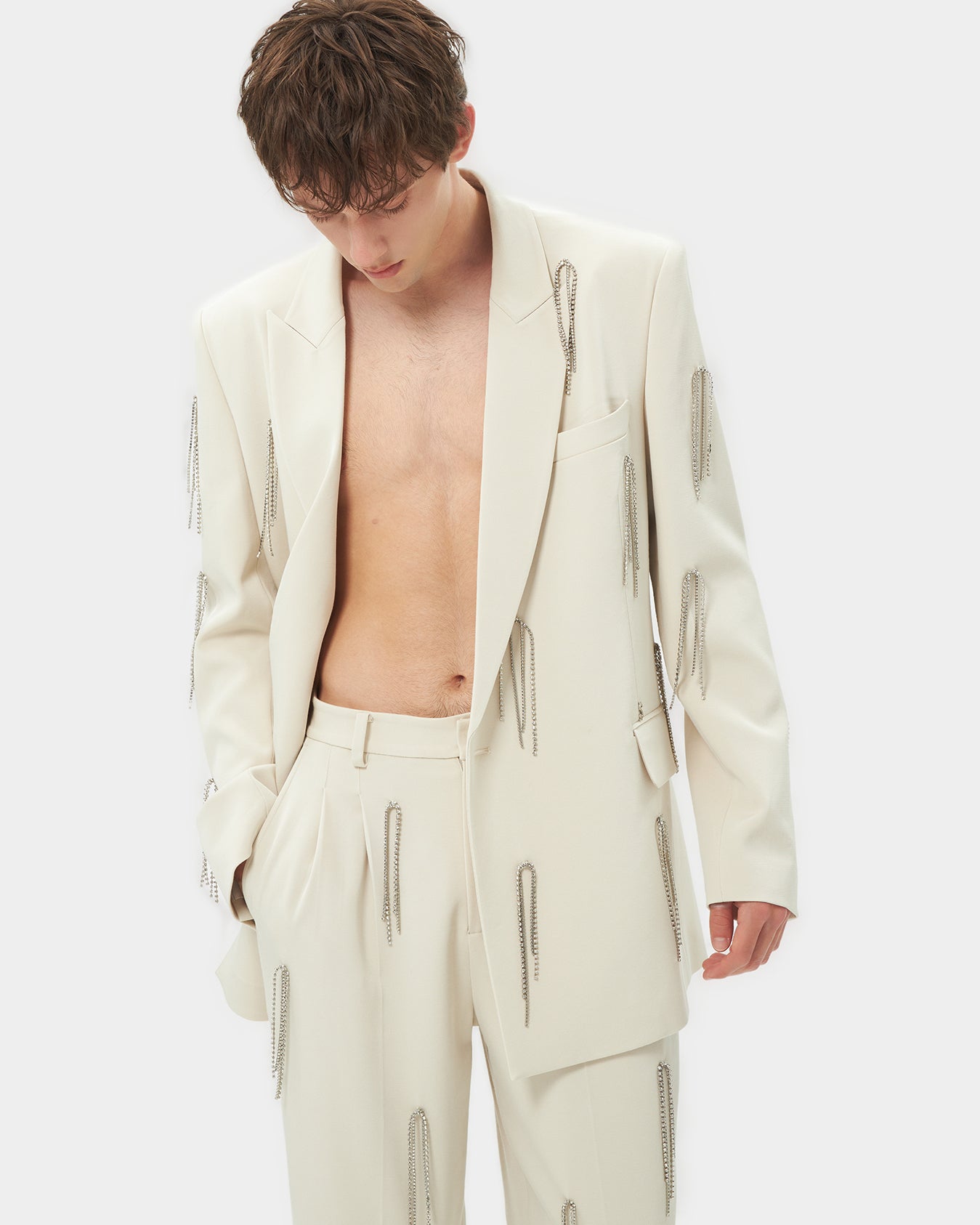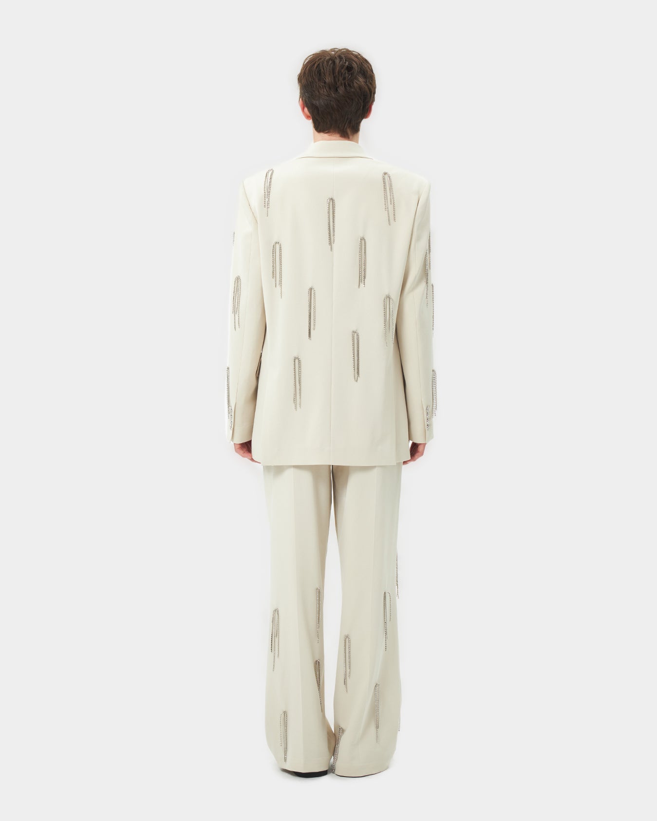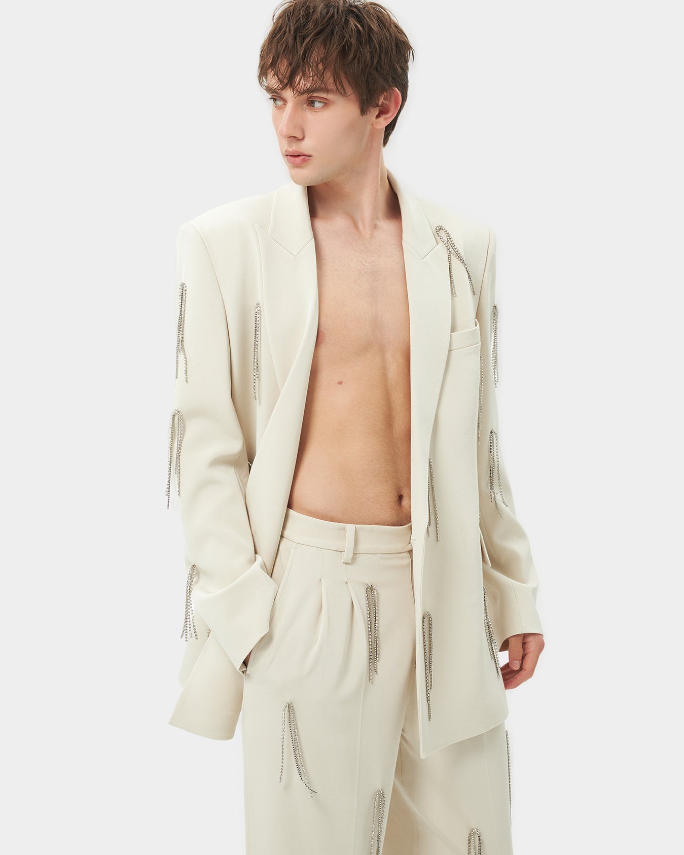 A loose-fit peaked lapel blazer adorned with fully handcrafted rhinestone fringe details.