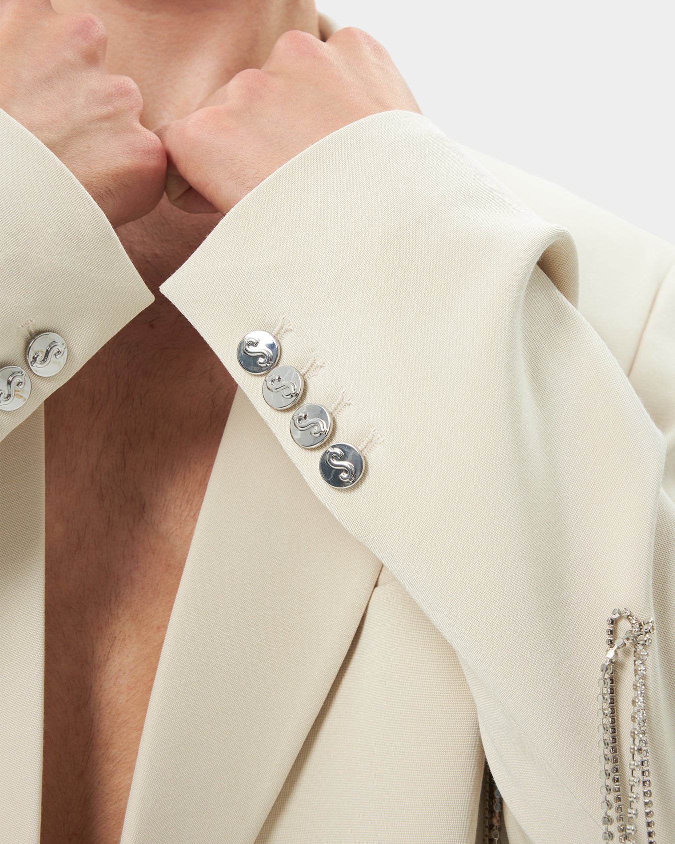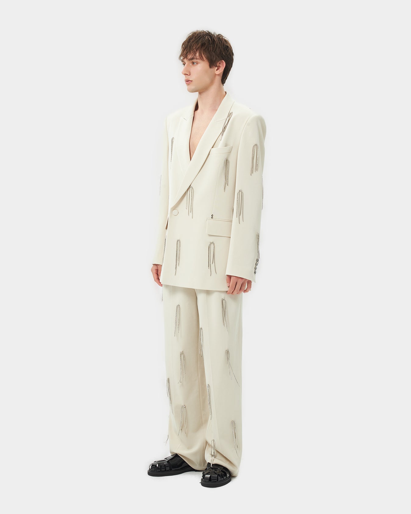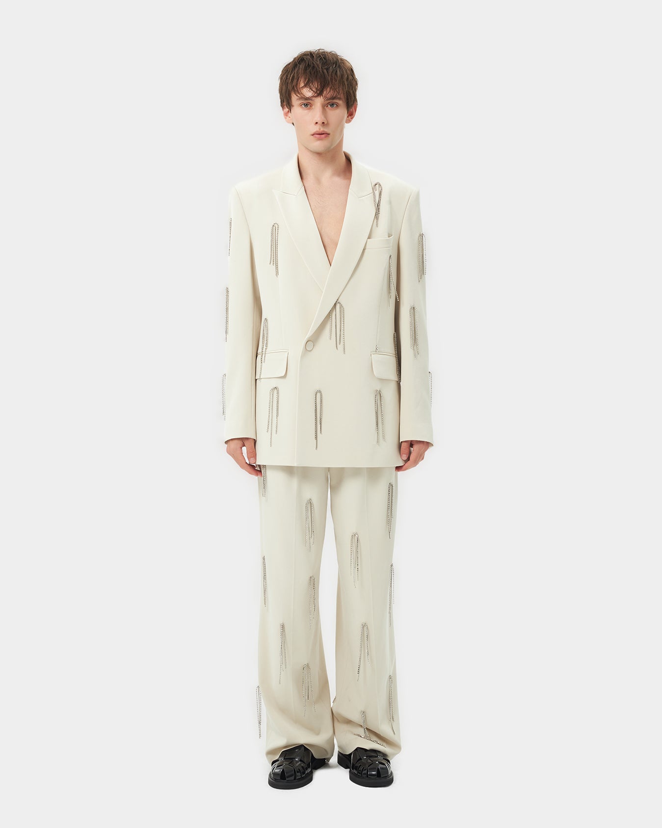 A loose-fit peaked lapel blazer adorned with fully handcrafted rhinestone fringe details.