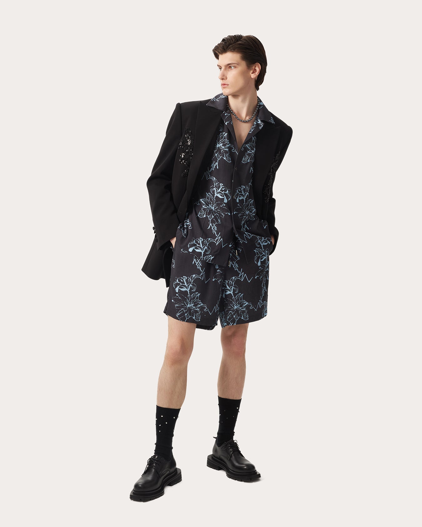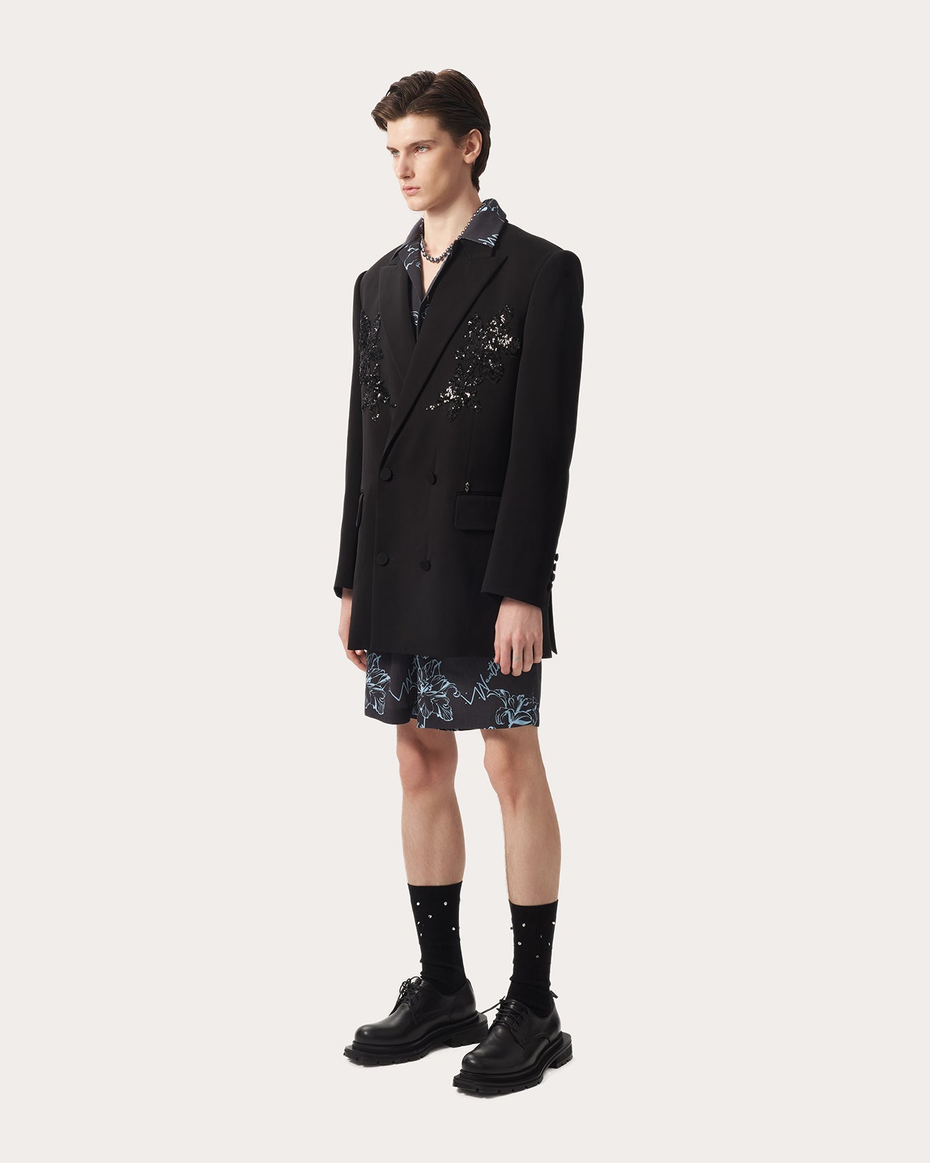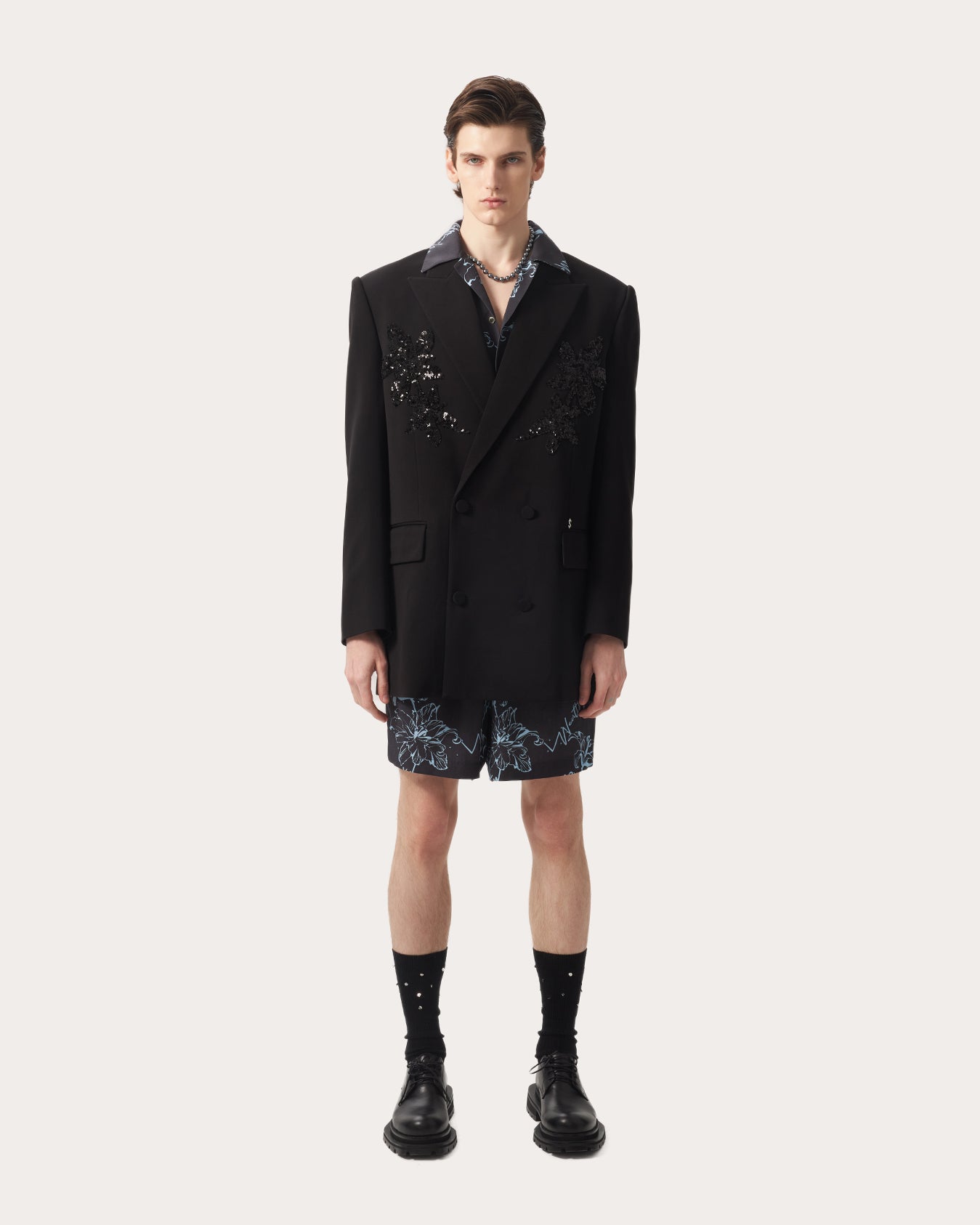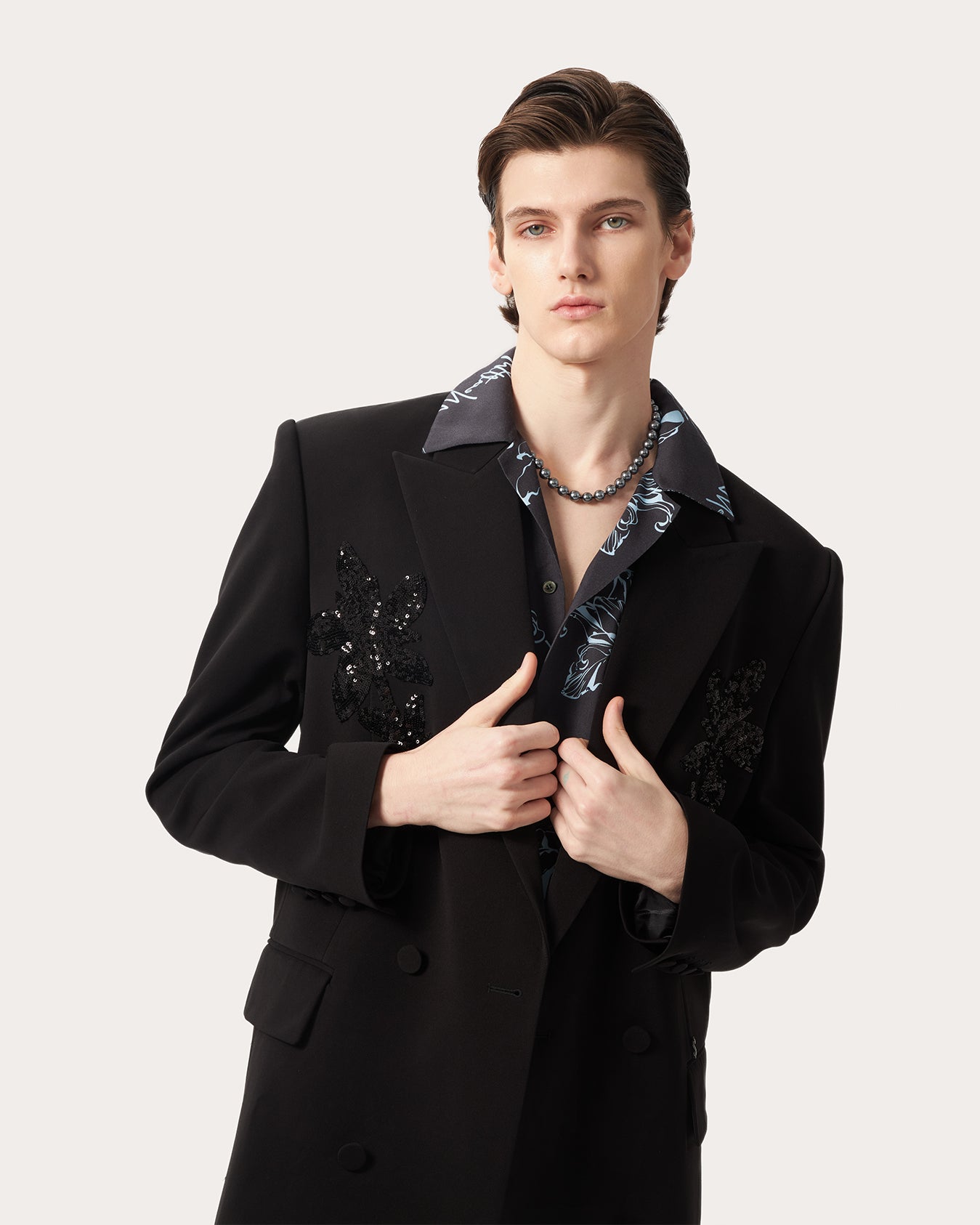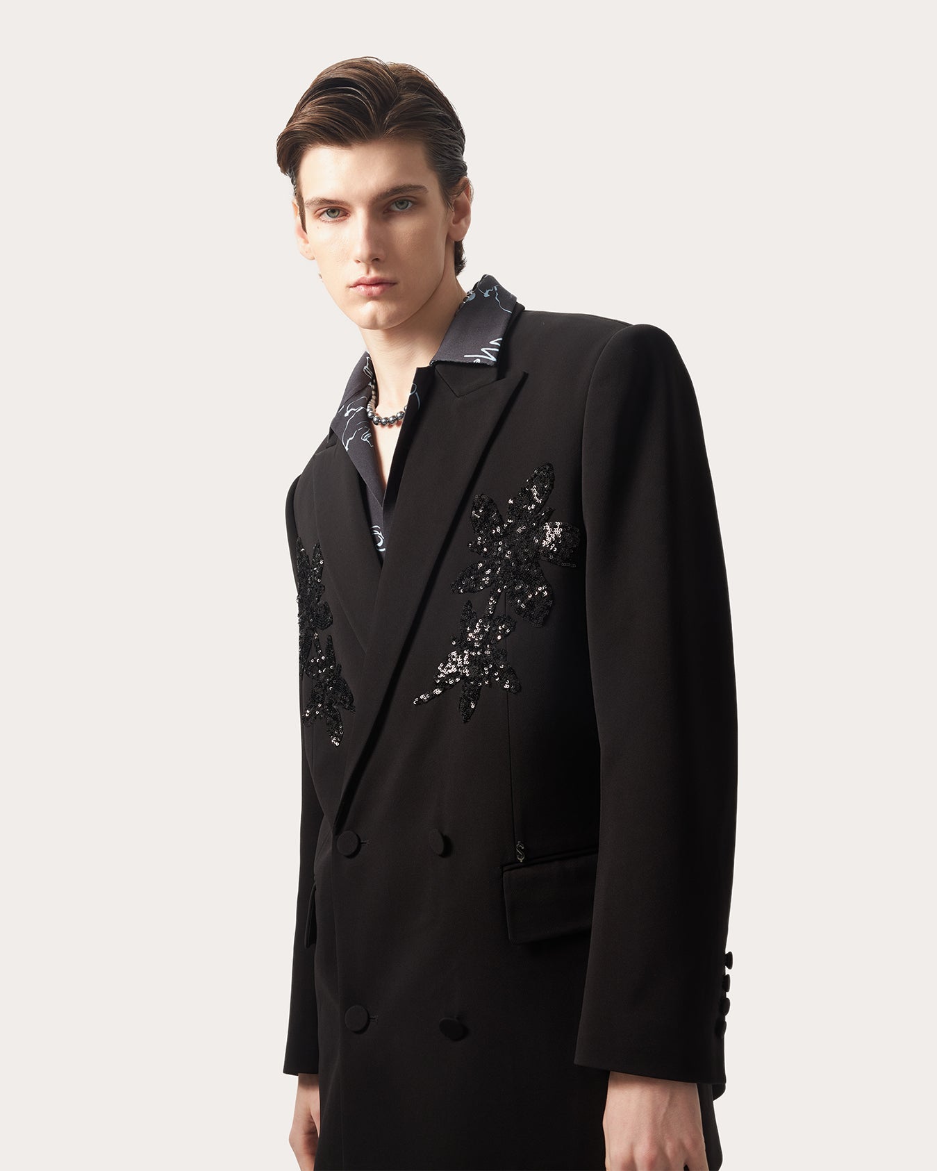 Double-breasted peak lapel blazer, adorned with sequin embroidery on the chest