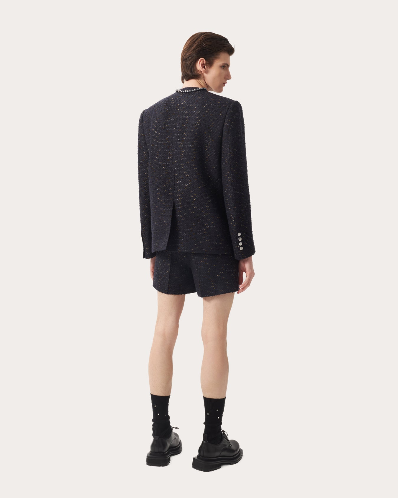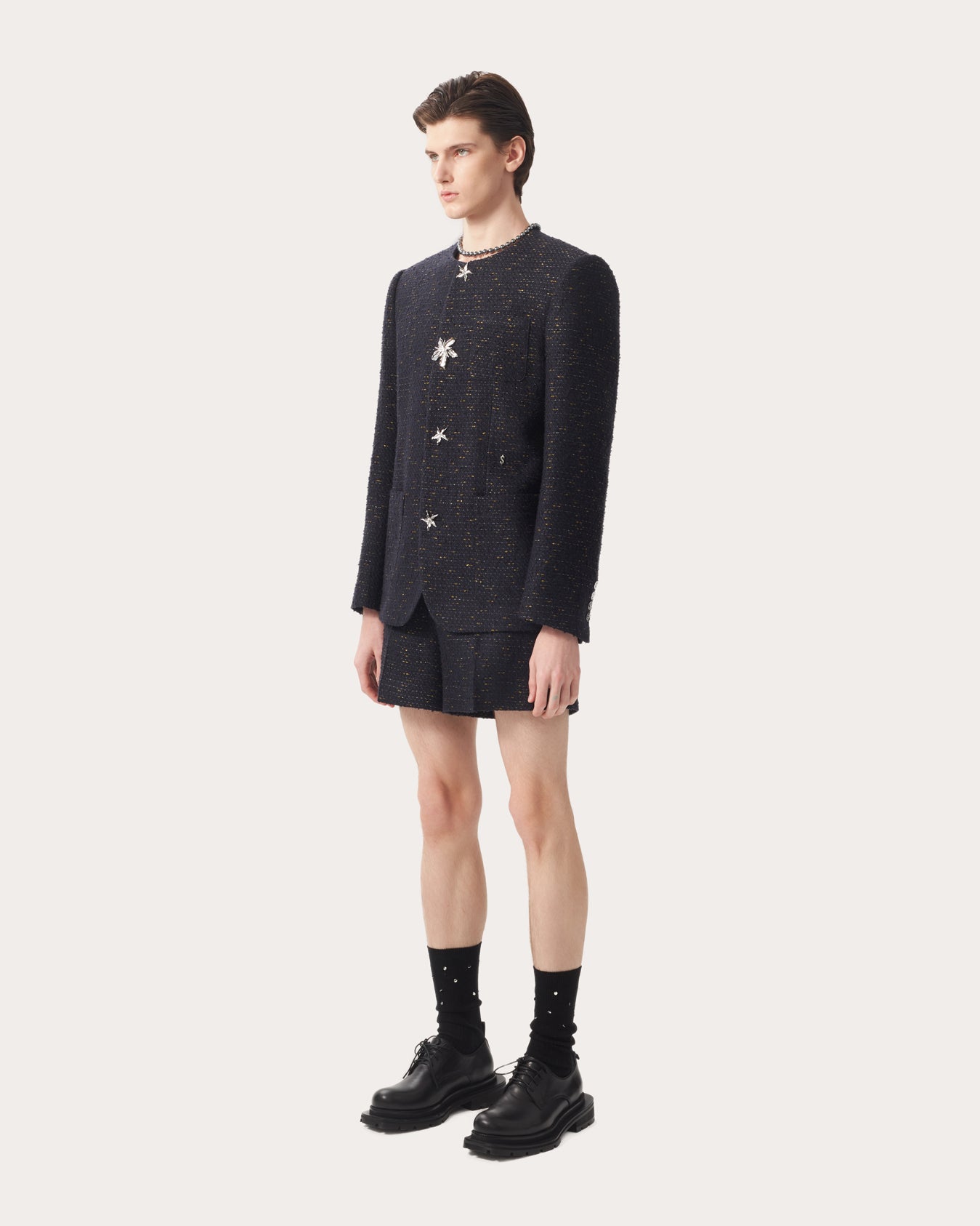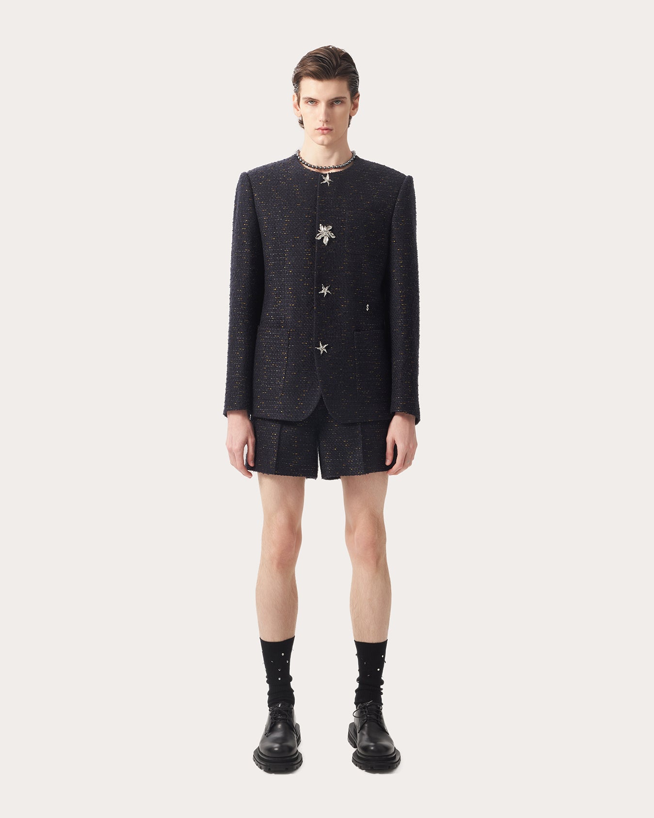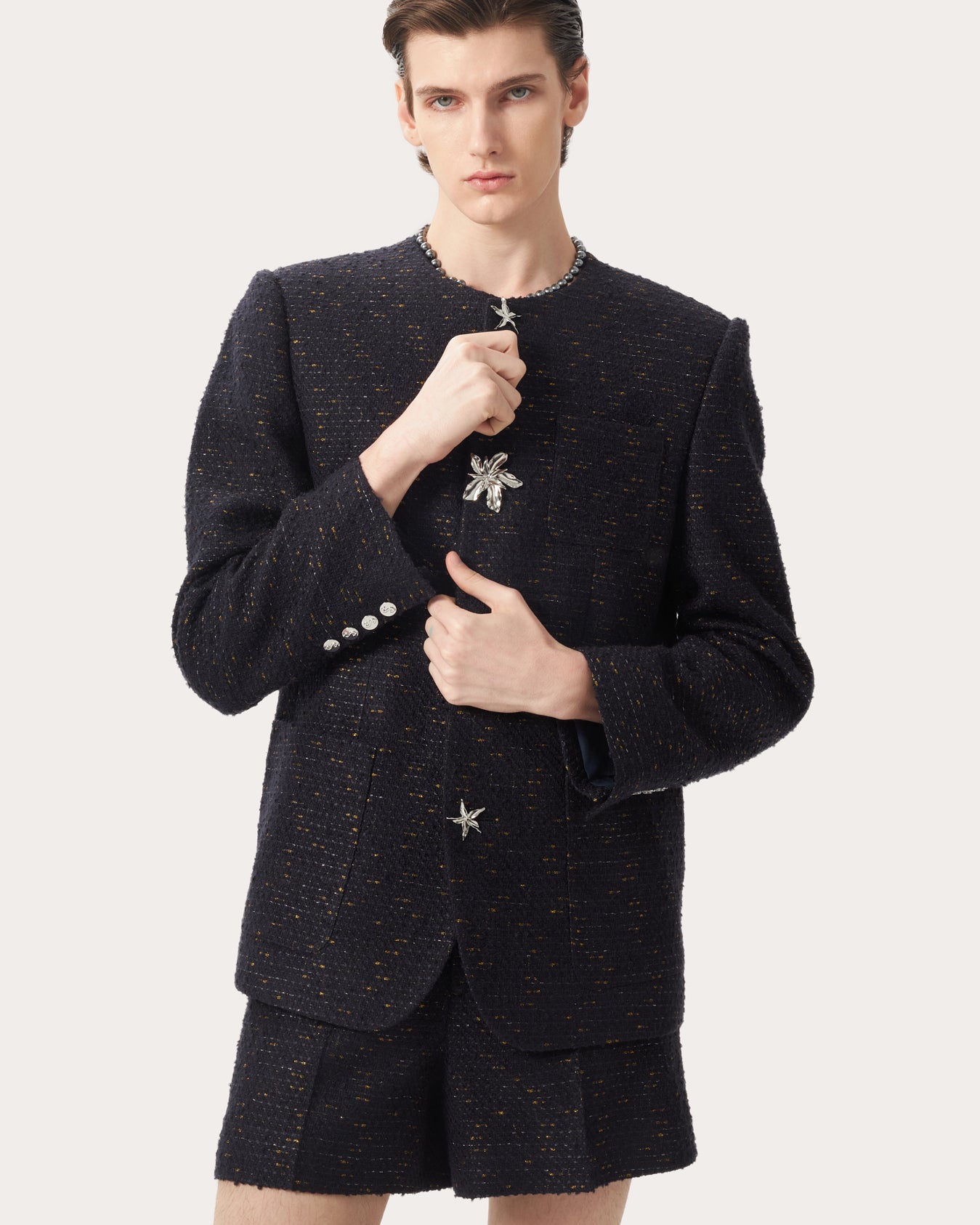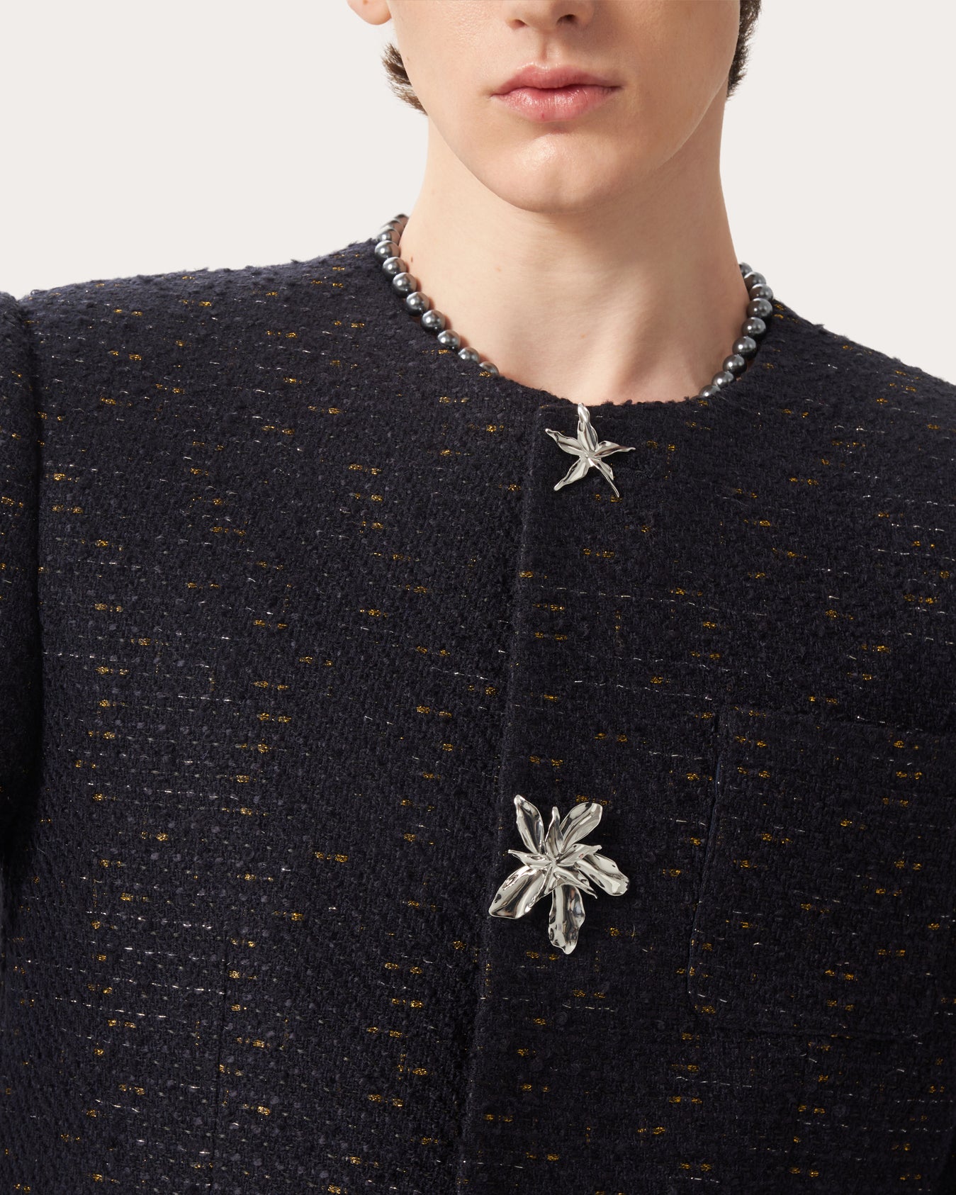 Round Neck Tweed Jacket with Military Vibe and Metallic Flower Embellishments